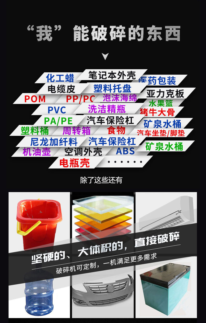 塑料破碎機(jī),大型塑料破碎機(jī)的特點(diǎn)強(qiáng)力破碎機(jī)刀具采用名廠優(yōu)質(zhì)精鋼精工而制,特別堅(jiān)固耐用,粉碎各類軟、硬塑膠,輕松容易。前后隔音防音設(shè)計(jì),噪音極小。設(shè)計(jì)精簡(jiǎn),占地特少,維護(hù)容易。門較式分離設(shè)計(jì),清掃換網(wǎng)特別容易。馬達(dá)裝有過(guò)荷保護(hù)與電源連鎖保護(hù),保護(hù)馬達(dá)、刀具、工作人員。制造工藝成熟、機(jī)體、刀架等主要部件采用整體加工,確保配合精度。粉碎膠頭、薄膜,有特別粉碎機(jī)供選擇,以更好的適應(yīng)。